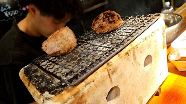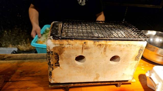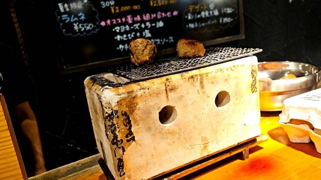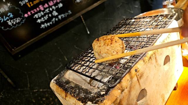 注文を済ませると、七輪にハンバーグが置かれた。あらかじめ厨房で焼いたモノを乗せてくれる感じだ。