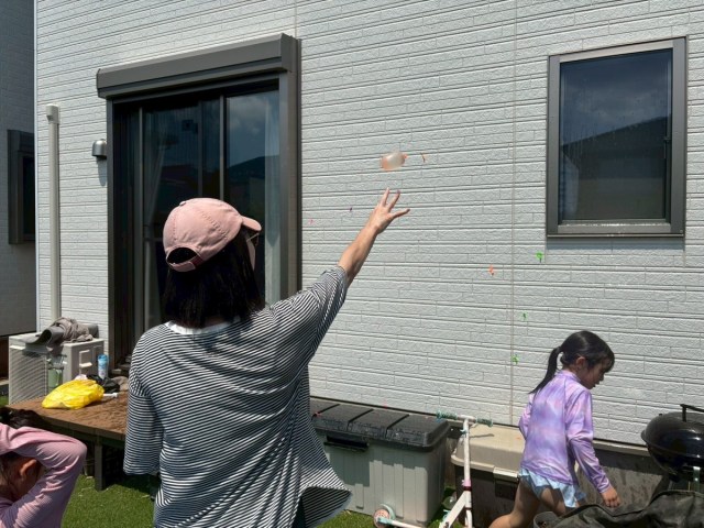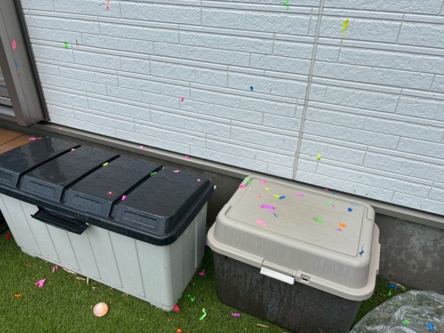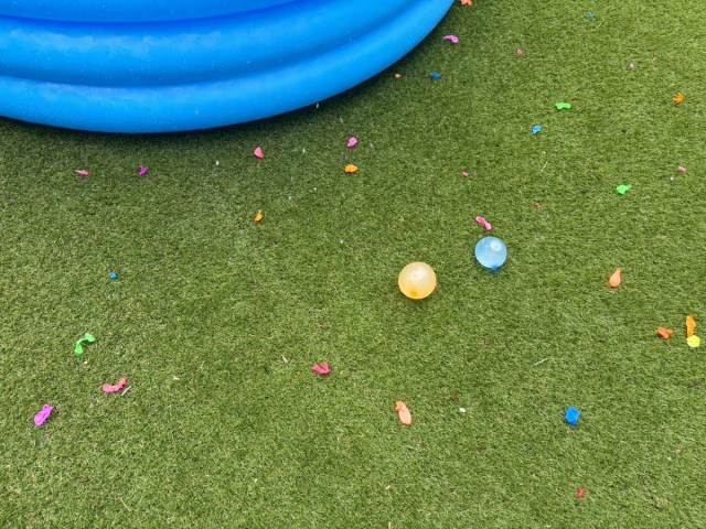 だが……30分ほど投げまくったあと、冷静に辺りを見て絶句する。割れたバルーンのゴム片が庭じゅうに散乱。