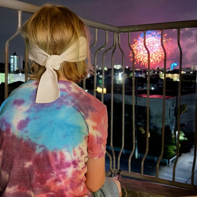 すると、現場にいたわけではないので分からないが、花火大会の始まりの合図を知らせる一発目の花火が上がったのか、「ドンッ」という音が鳴った。始まったのかも……ベランダへダッシュするアメリカンキッズ。大人5人・子供1人なので、大人はまだ食事に夢中だった。