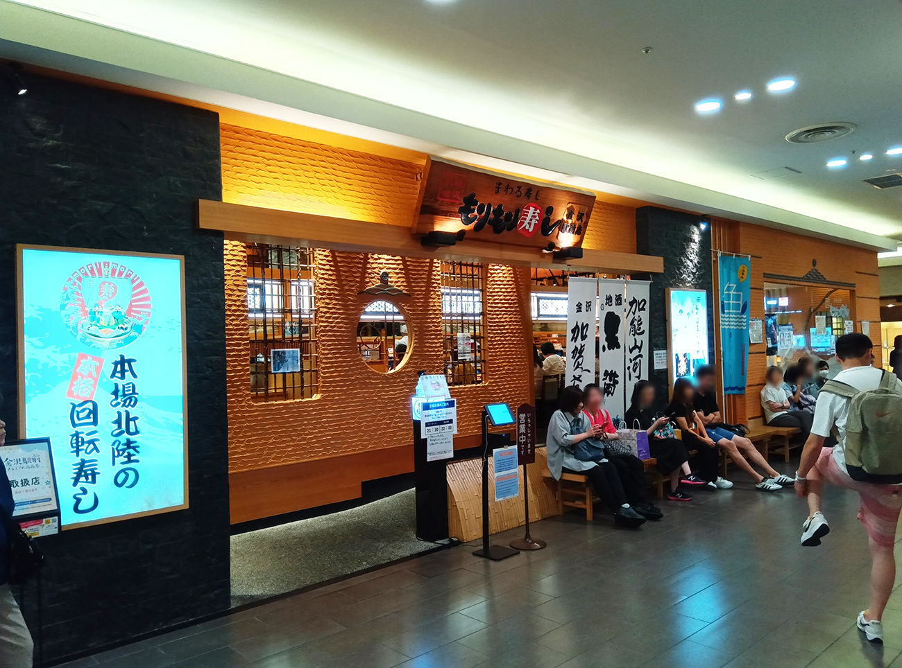 お店は駅前のショッピングモール「金沢フォーラス」の6階にあるという。フォーラスは、ちょうど宿泊しているドーミーインの真ん前にあった。ホテルが建ち並ぶ場所なので観光客的にも便利な立地である。エスカレーターで6階に上がると、ちょうど目の前にその回転寿司屋が佇んでいた。