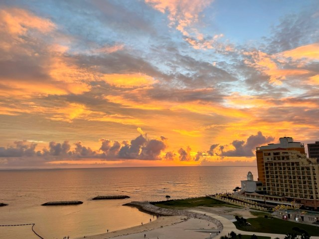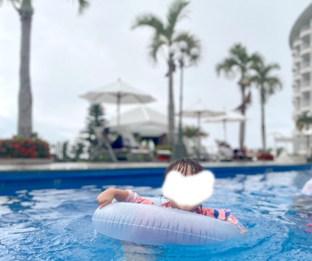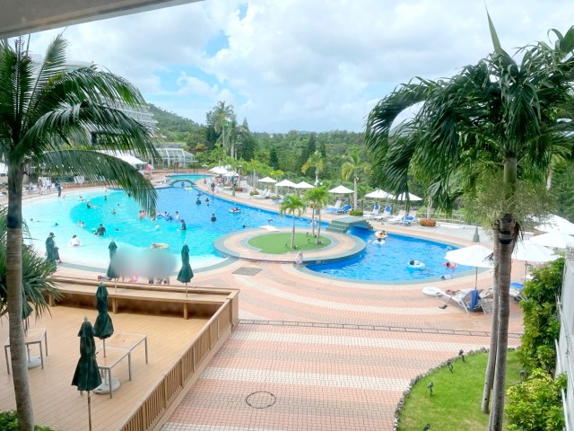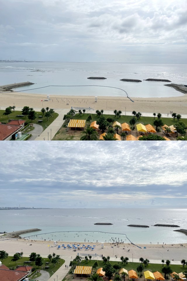 夕方になると天気も回復し、ようやくキレイな海を見ることができた。その後はナイトプールを楽しんで、無事に沖縄初日は終了。