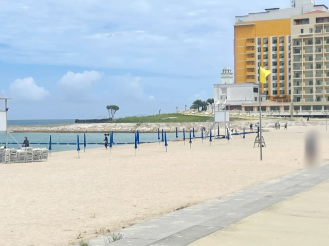 砂浜には、「遊泳可能だが注意が必要な状態」を示す黄色い旗が立っている。