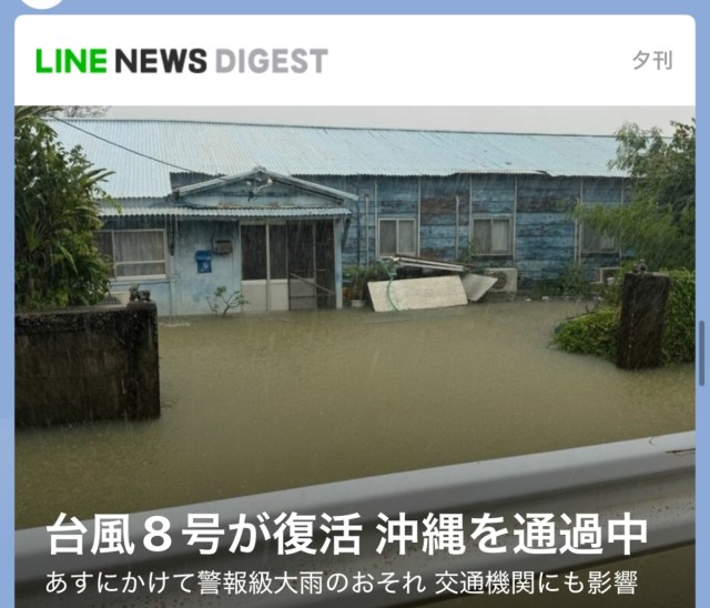 思えば今回の沖縄旅行は、出発前から天候トラブル続きだった。前日7月27日の夜、一度は勢力を失った台風8号がまさかの復活。沖縄本島付近を通過するという事態に。