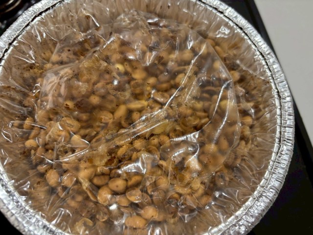 冷めたらフィルムを剥がして豆を取り出し、薄皮をうちわで扇ぎながら除去する。