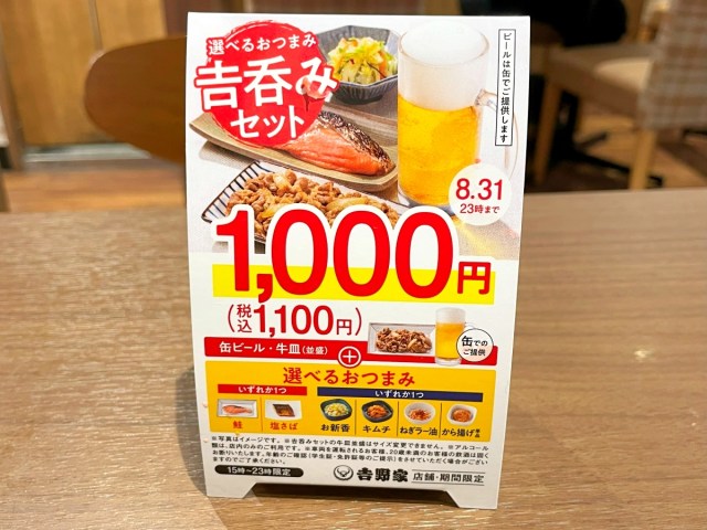2025年8月1日から8月31日までの期間限定で始まった「選べるおつまみ吉吞みセット」(税込1100円)。なんとビールと人気のおかずを自由に選べるという。マジかよ、牛丼食ってる場合じゃねぇ……!