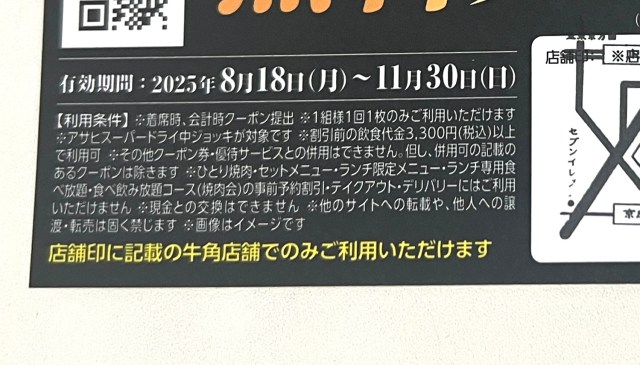 有効期間も、お食事券と変わらず2025年8月18日から11月30日までだが、こちらも購入した店舗でしか利用ができない。その他にも、他のサービスと併用できないなど牛角での食事を、より楽しくしてくれる夏らしい特典だが個人的にはおまけ程度に考えた方がいいと感じた次第だ。