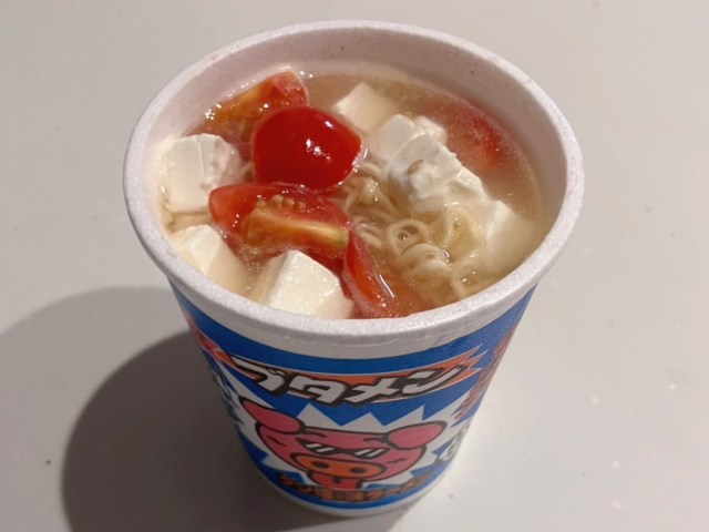 が、これがちょっとクセモノだった。冷たいトマトを入れたせいか、3分じゃ麺が少し硬め。