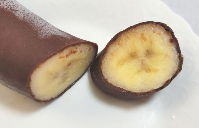 ローソンが他社を意識したかは定かでないが、狂気とは程遠い、「後発として先達を追い抜く」という打算めいた気概さえ受け取れる。ならばこちらも、冷凍チョコバナナのレビュー請負人として見届けるほかあるまい。ボリュームに続いて、味の方はどうか。