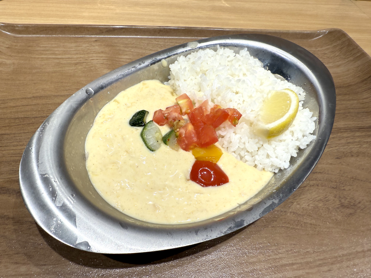 やってきた『冷やしレモンクリームカレー』はライスにクリームシチューをぶっかけたようなビジュアルで “カレー感” は皆無に等しい。冷やしだからか、カレーの香りも漂って来なかった。