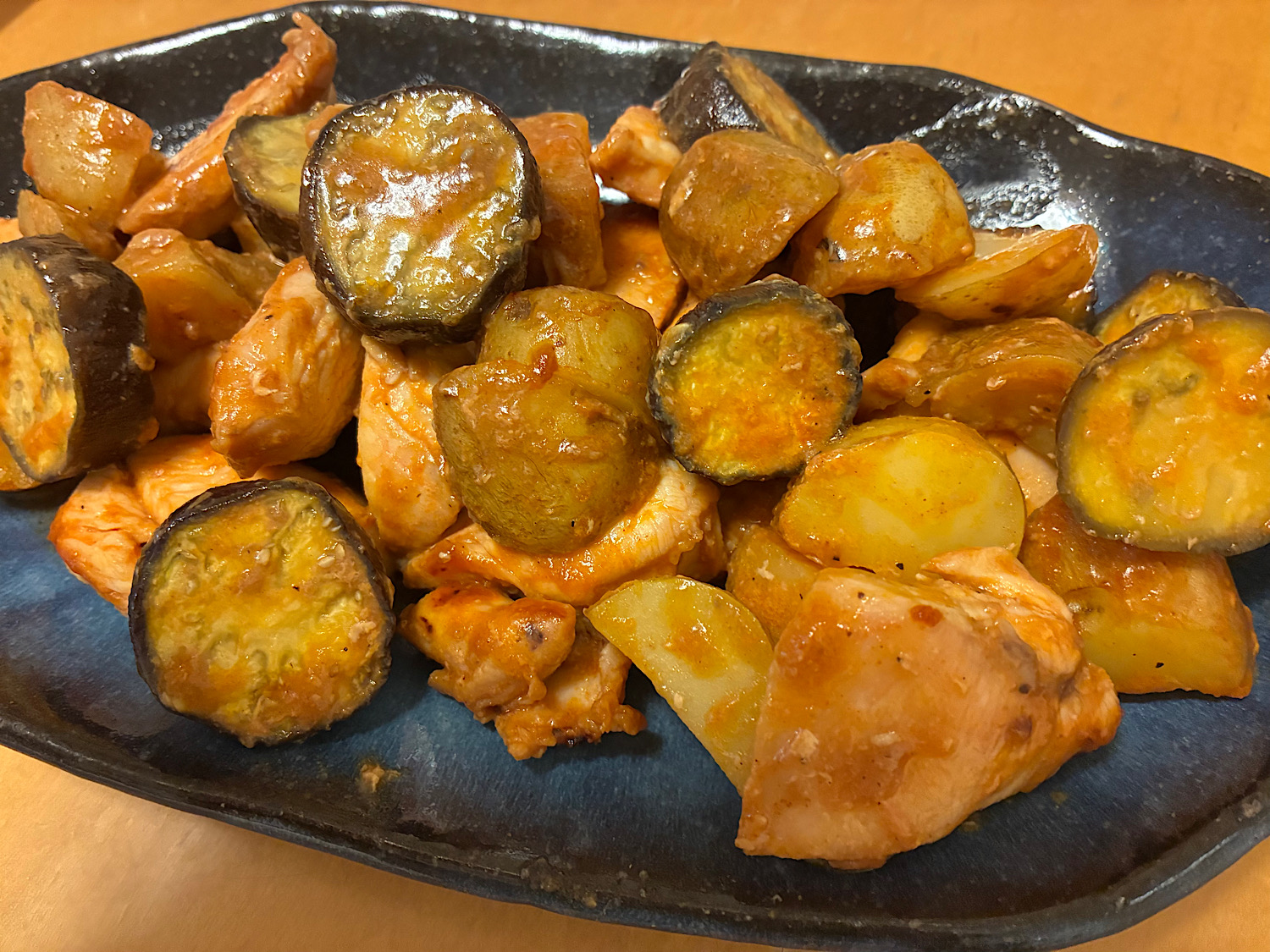 ▼もう片方の「甘旨ヤンニョムチキン」はこんな感じ。「甘」旨とある通り一切辛くない。冷蔵庫にあった茄子とじゃがいも(レンチン後)を炒め合わせたらさすがにちょっと薄味になってしまったが、美味い。