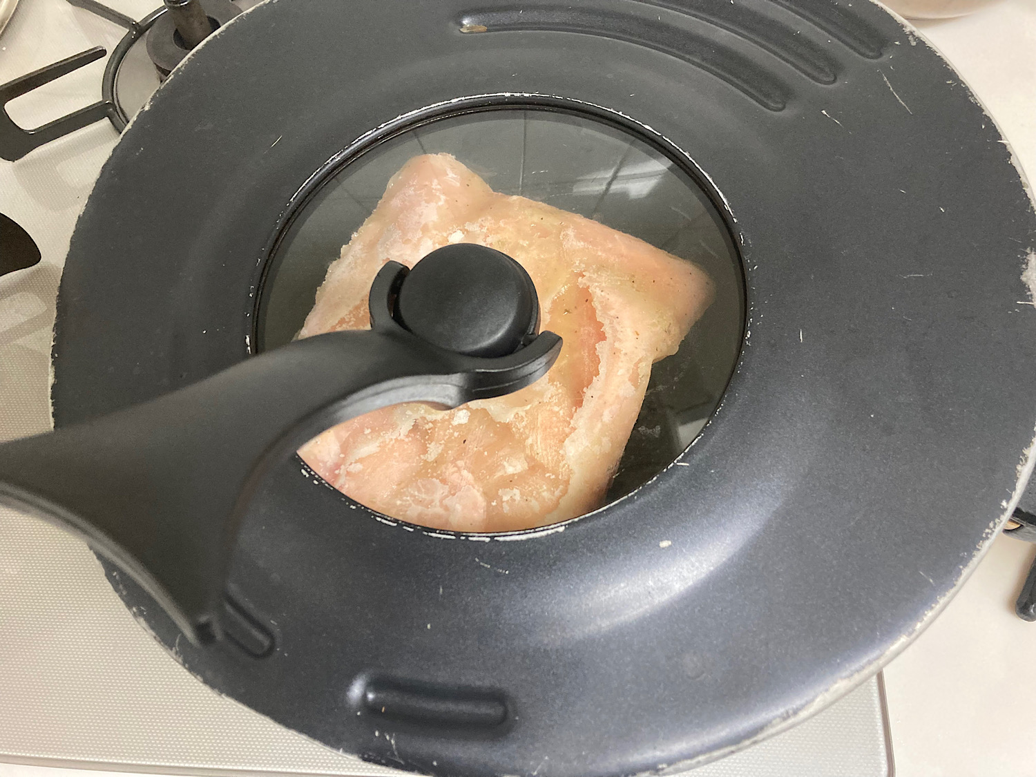 で、油もいらないのでこのまま弱火にかけ、蓋をして8分。