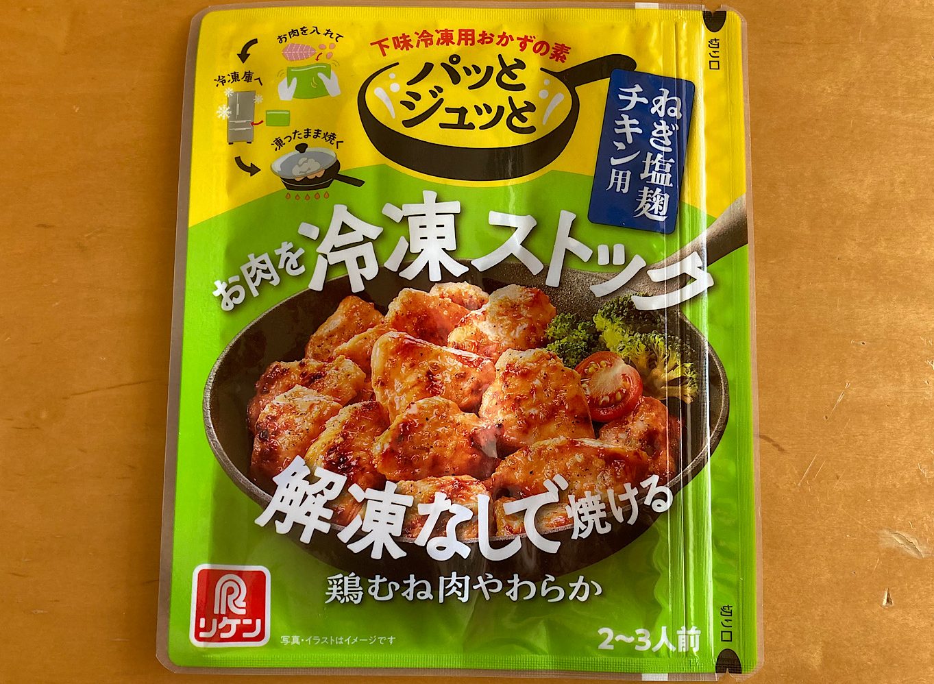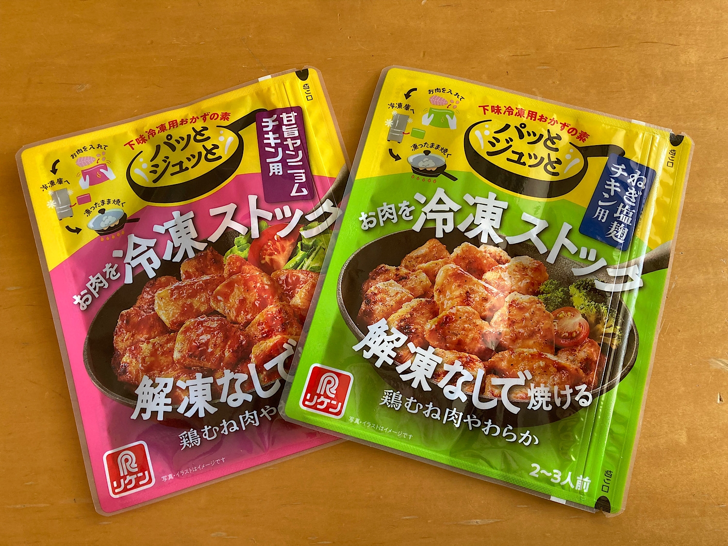 それがこちら。リケンの「パッとジュッと」という袋入り料理の素で、ラインナップは「ねぎ塩麹チキン用」と「甘旨ヤンニョムチキン用」の二種。