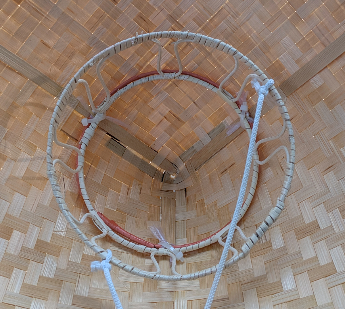 菅笠や三度笠の内側には、五徳(ごとく)と呼ばれる台座があり、これを頭に乗せることで、笠が安定する。
