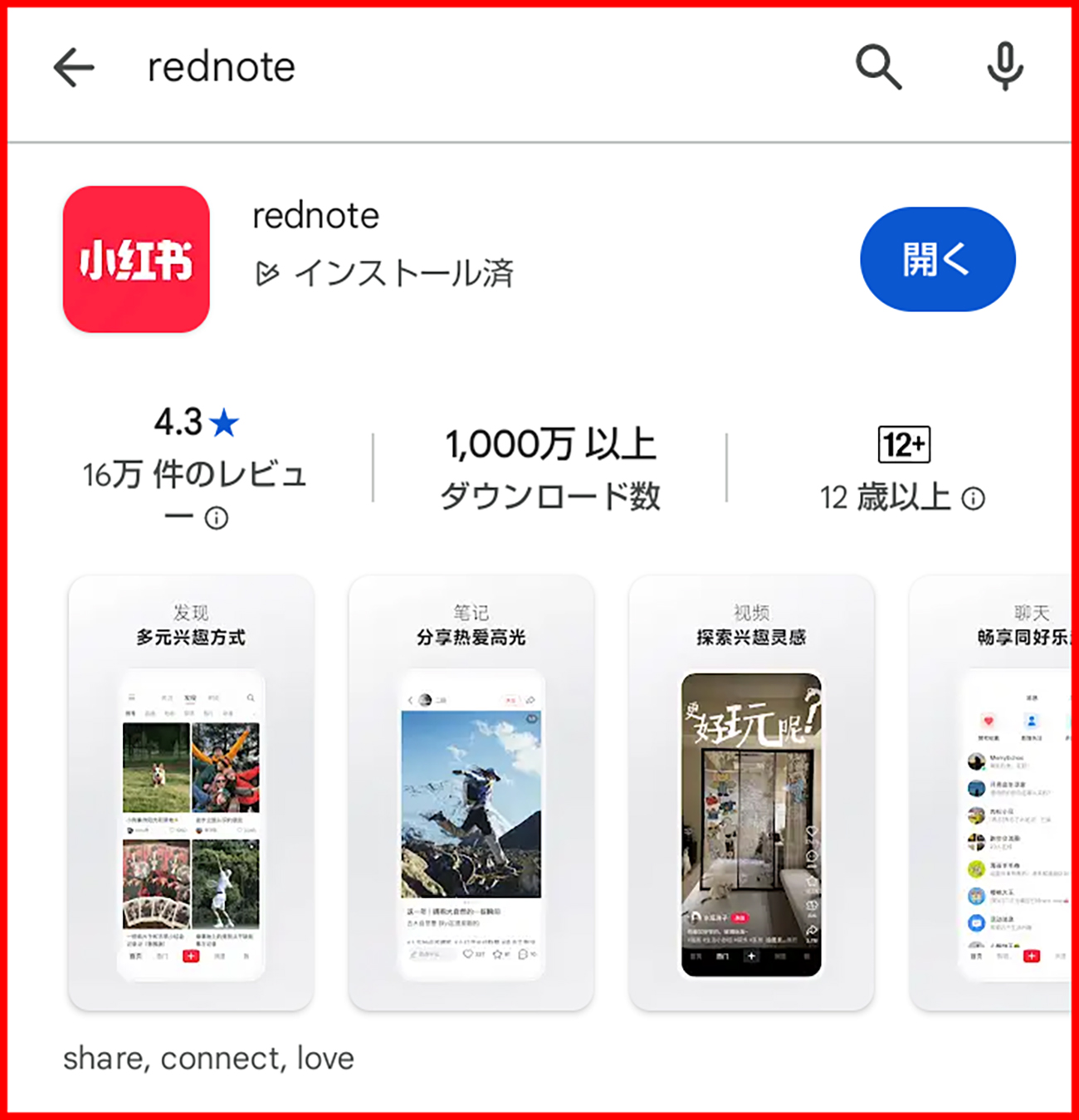 そんなルー氏がオススメしてきたのが『rednote』。どれかと言うとインスタっぽいSNSなんだそうな。検索したら、確かGoogleのPlayストアにもあった。