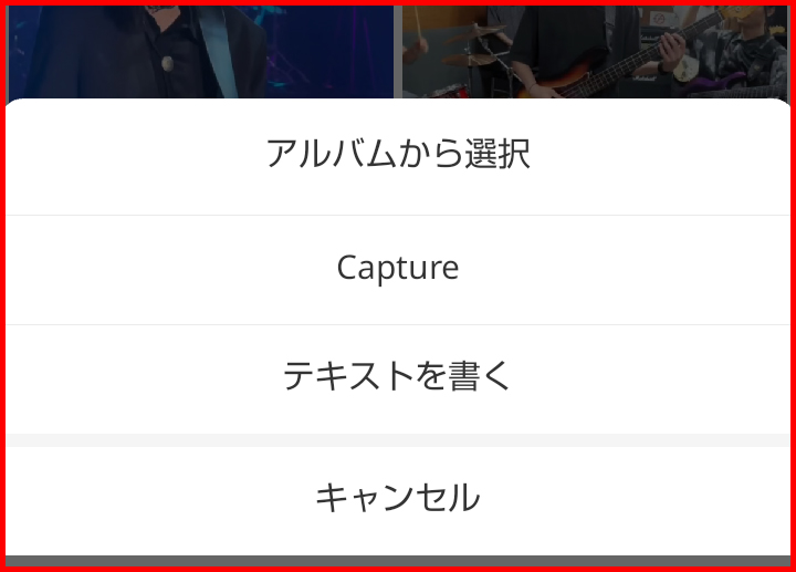 可能な投稿は動画、画像、キャプチャー、文字のみの4つ。動画、画像はアルバムからの選択で、キャプチャーはカメラにアクセスして撮影するスタイル、文字のみは初期Twitterみたいな使い方だ。