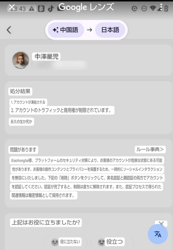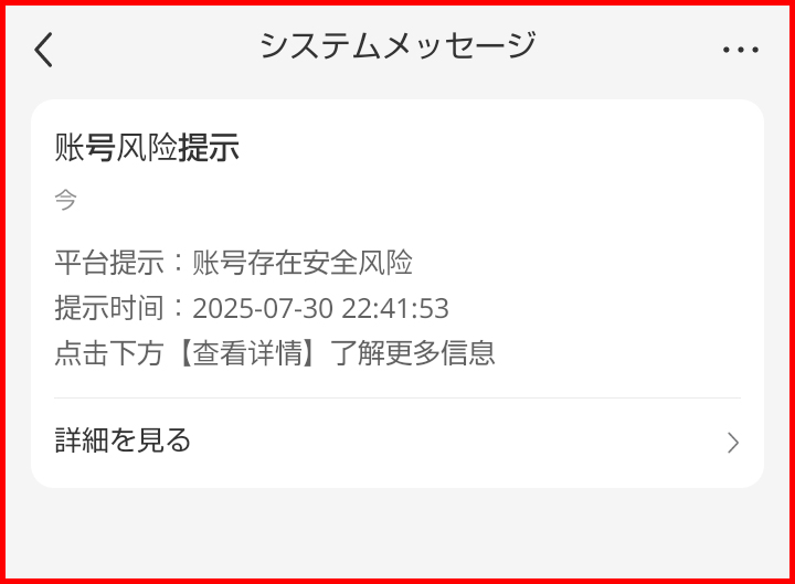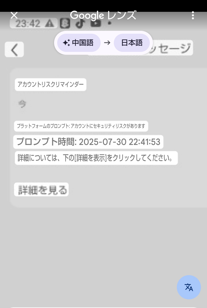 開いてみたところ、ガチの中国語すぎて読めない。漢字を頼りに意味を推察できる範疇を超えてるメッセージだ。Googleレンズで翻訳したところ「アカウントリスクリマインダー」と書かれている。