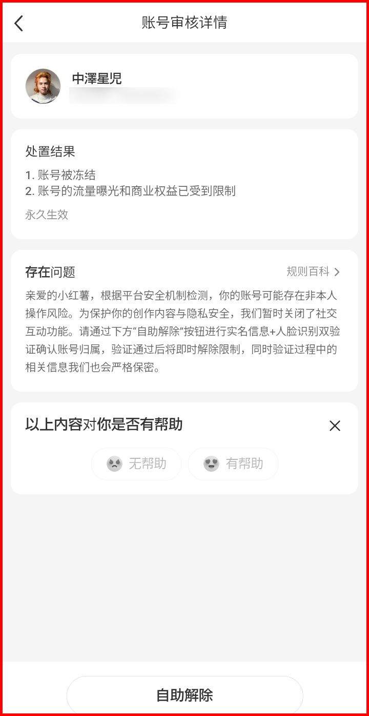 1つ思い当たる点と言えば、動画を投稿する際、別端末にSIMを入れ替えてログインしたこと。前端末に入ってた過去動画を使ったため、端末間の動画の移動が面倒くさくてそのままアップロードしたんだけど、ひょっとしたら2端末でのログインが不審に映ったのかもしれない。さて置き、幸いにも詳細画面の下には「自助解除」というボタンがある。