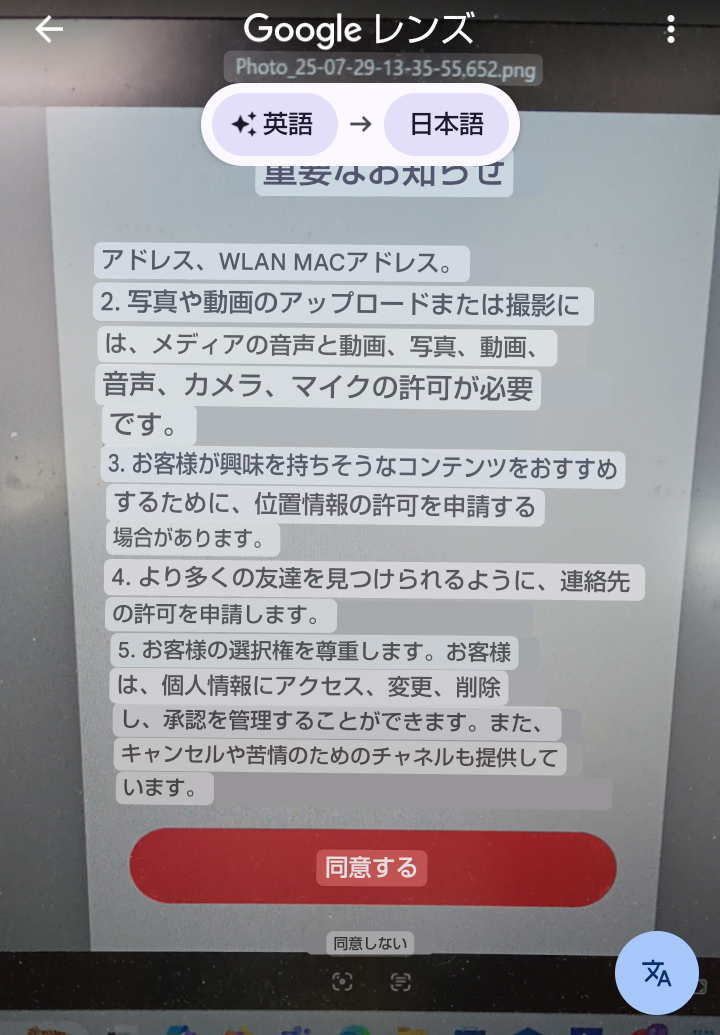 英語の注意事項が表示された。Googleレンズで翻訳してみると、ここにはデバイス情報、IPアドレスや連絡先の許可を申請しますよってことが書かれている。まあ今日びのSNSって感じでは、特に不自然な点は見当たらない。
