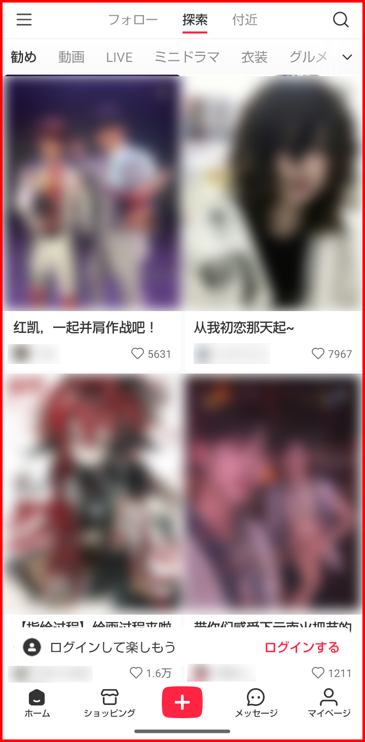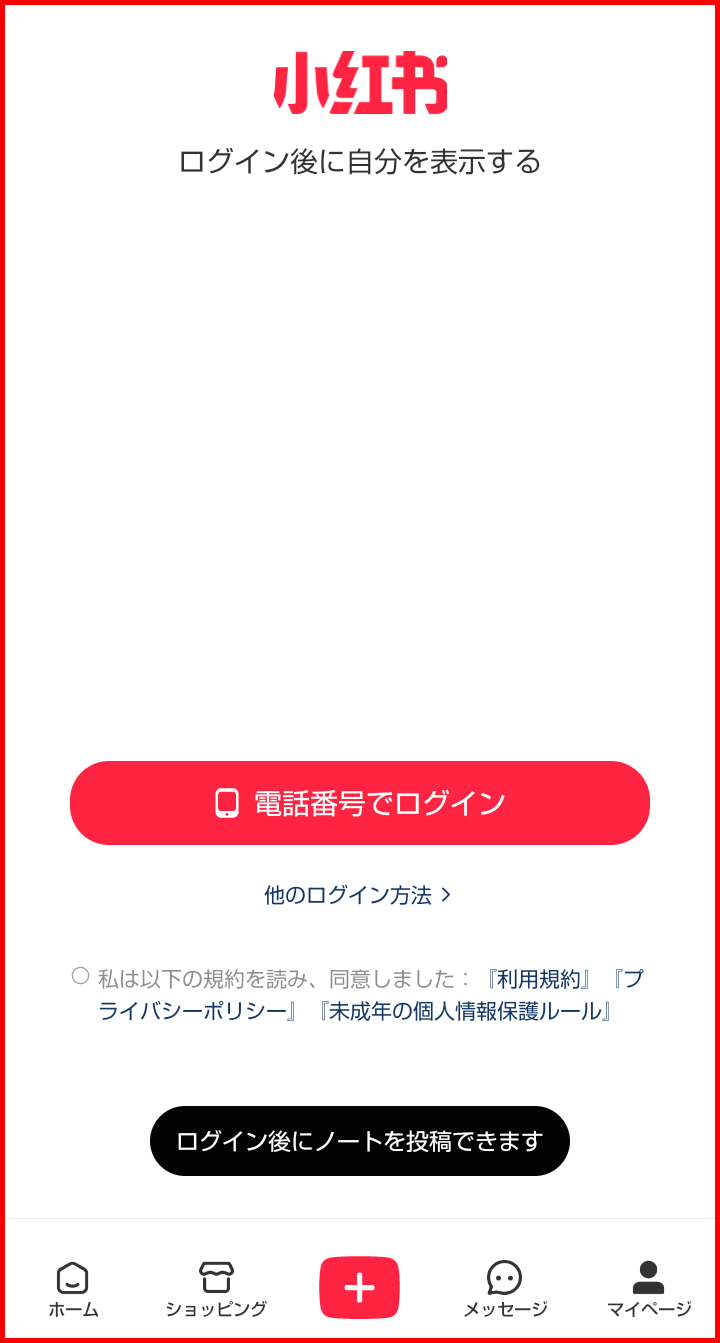 ただ、私は投稿がしたい。中国のネットで売れたいのだ。そこで画面下にあるタブの「+」ボタンを押したところ、ログイン画面が表示された。どうやら、投稿はアカウント登録が必要な模様。