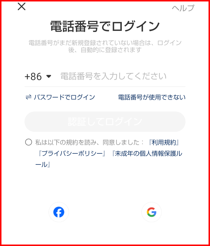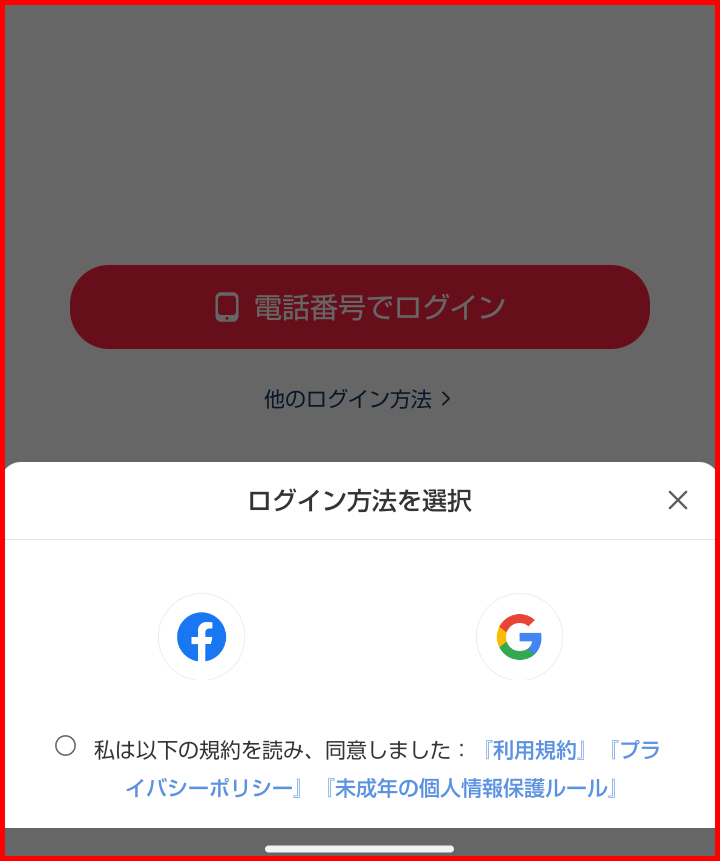 ログイン画面には「電話番号でログイン」と「他のログイン方法」がある。そこで他のログイン方法を確認してみたところ、FacebookかGoogleとの連携であった。