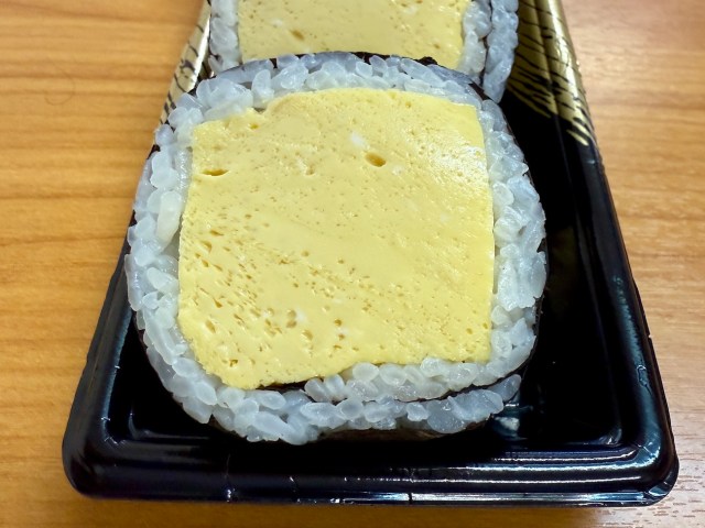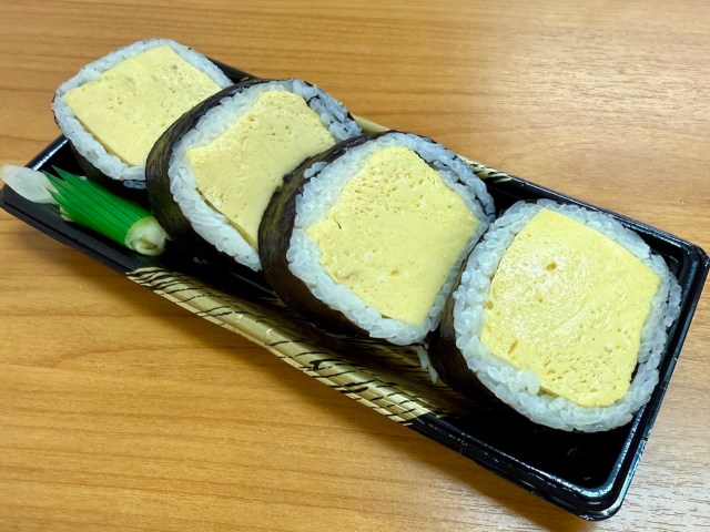 ふたを開けると、角材のように分厚いだし巻きがビシッと並んでいた。この潔さですよ。「巻き寿司はシャリと具材のバランスが命」と言われているが、ほぼ玉子で成立させてしまう強烈な職人技。