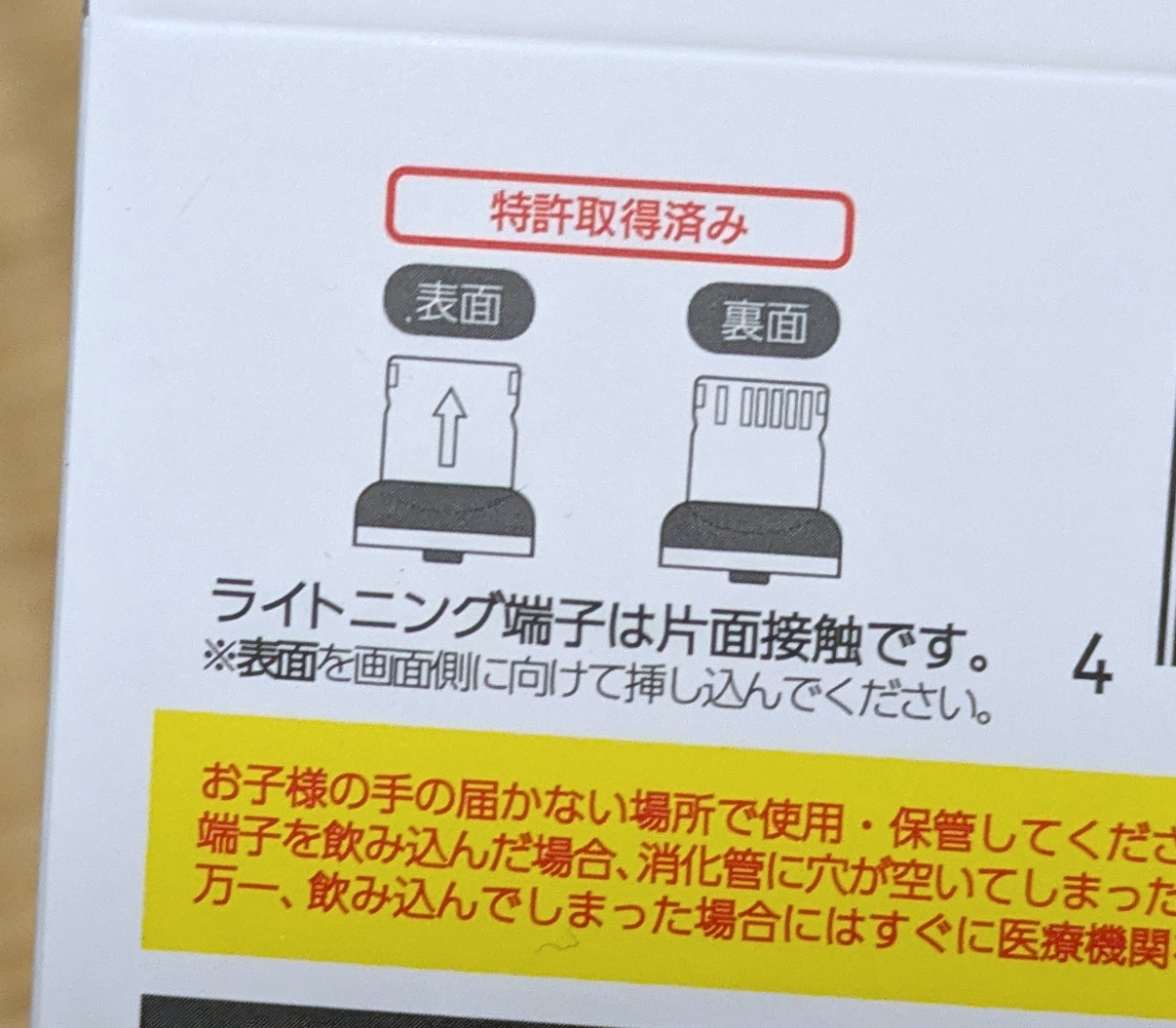その特許について、箱の裏面に記載がある。それは片面接触のLightning端子! 両面使えるのがLightning端子の本来の特性のはずなのに、それを片面にして特許を取れるとは!? そういうものでも特許って取れるもんなんですねえ、驚いたよ。