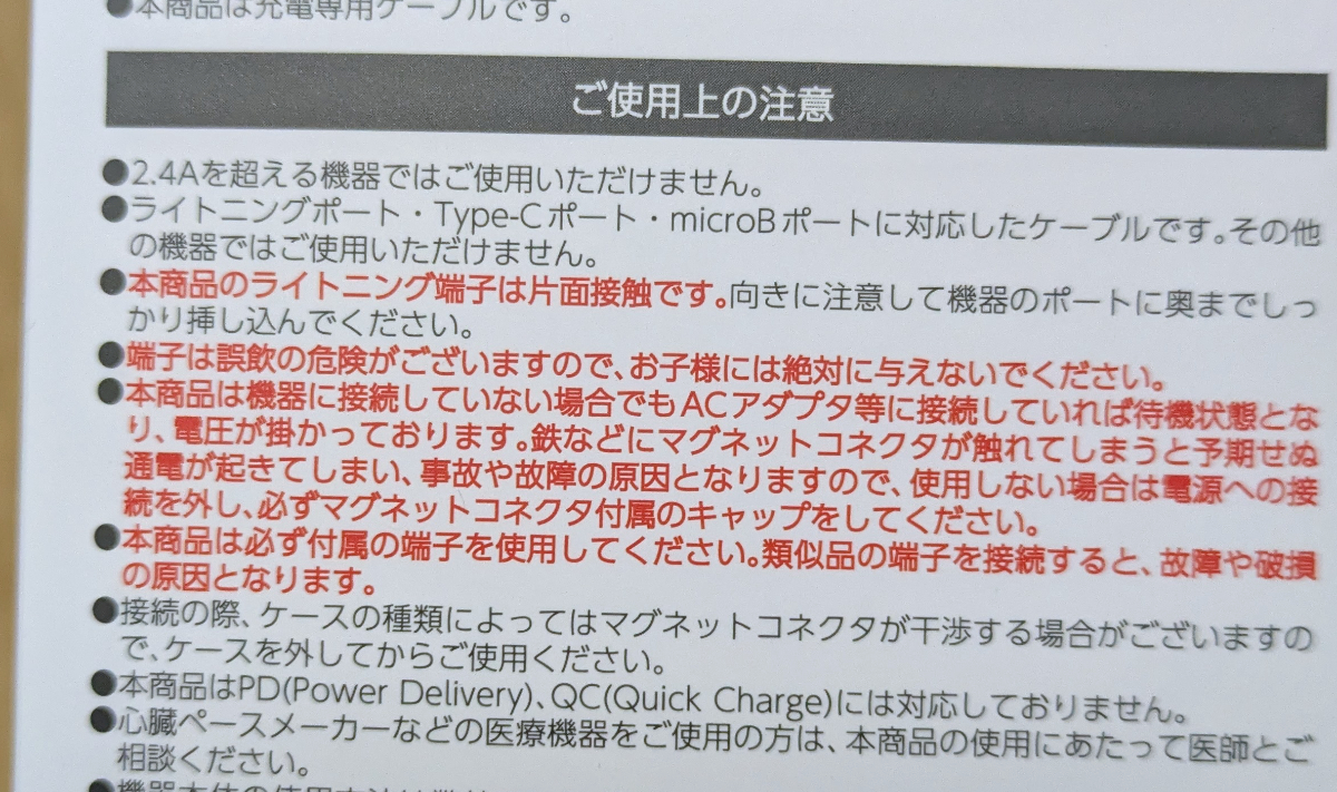 なお、使用する際は注意事項をよく読んで頂きたい。2.4Aを超える機器では使用できなかったり、未使用の状態ではケーブルにキャップを装着しなければならない。また小さな端子の誤飲の危険があるので、子どもの手の届かない場所で使用・保管するとのこと。