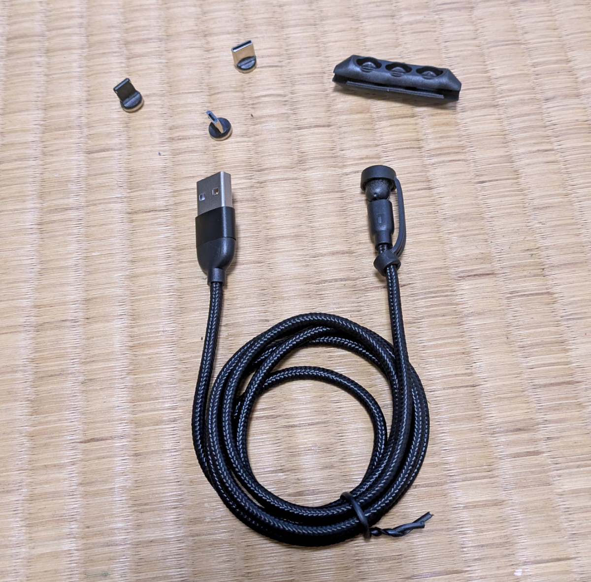 ケーブルに付属しているのは、Lightning・Type-C・micro-Bの3種の端子。それから端子のホルダーである。