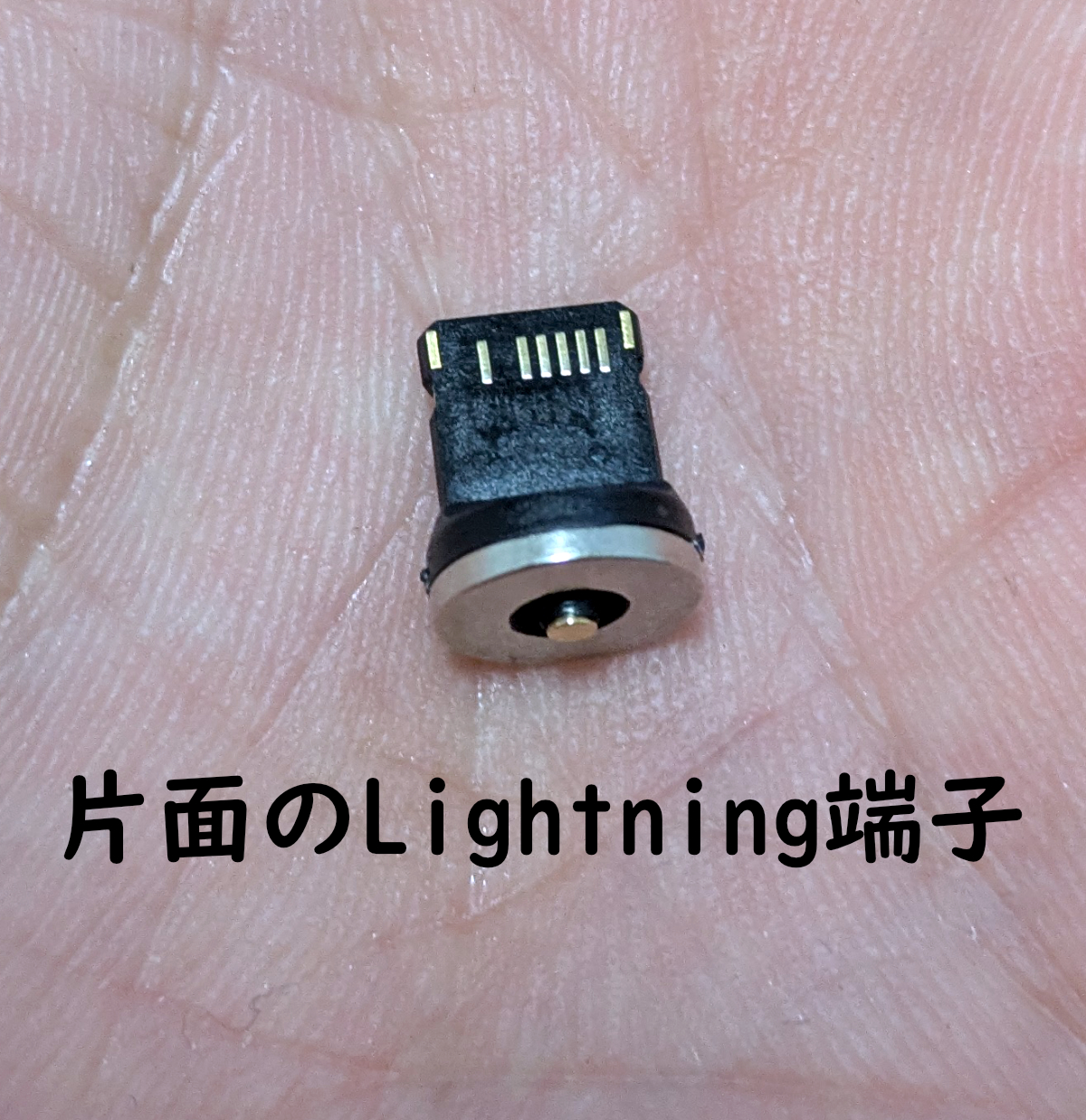 これが特許を取得している片面のLightning端子である。これら端子をスマホのコネクタ部分に装着して使用する。小さいながら磁力はかなり強力だ。