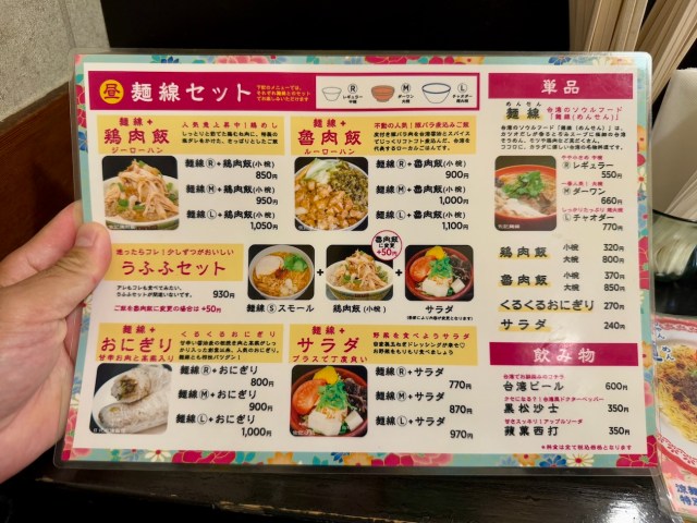 ランチタイムのメニューは「麺線セット」が主役。麺線のサイズを中椀・大椀・超大椀の3種類から選んで「鶏肉飯(ジーローハン)」もしくは「魯肉飯(ルーローハン)」を付けるというもの。