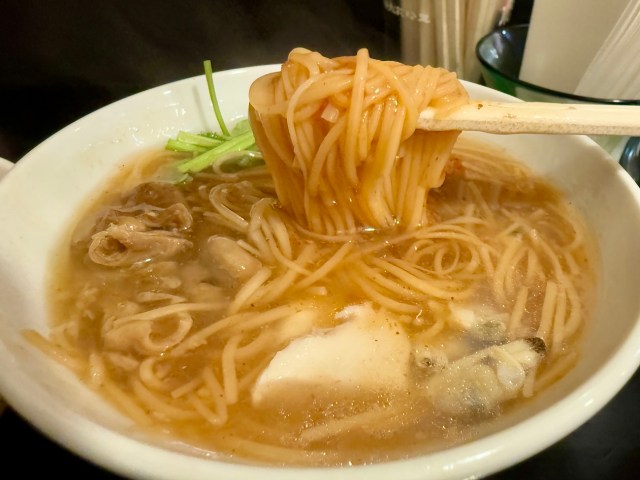 これはまさに求めていた味。とろみのあるカツオ出汁のスープと台湾独自の極細麺がスルリと口に滑り込む。豚モツの台湾醤油煮や鶏肉、アサリ、パクチーも入っていてあっさり美味しい。派手さはないが、たしかな満足感が続く。大椀サイズにしておけばよかった……!