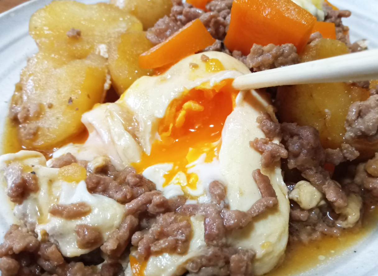別物やん。特に、食べごたえがちょっと物足りない。そこで試しに卵を入れてみたら、白身がひき肉を塊にしてくれて良い感じになった。「にんじんが食べられないからただのじゃが」と言っていた夏色まつりさん。参考にしていただけると幸いでござる。