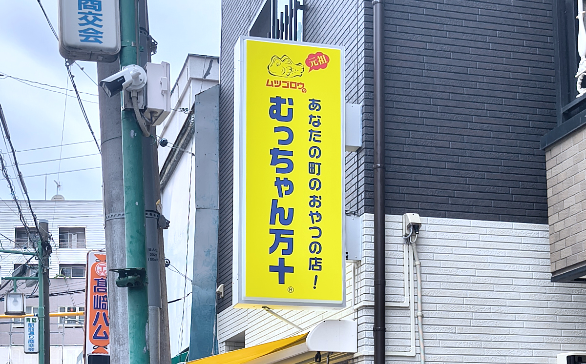 それはさておき、駅を出るとすぐのところにあった~! 黄色い看板のむっちゃん万十!! おかえり、むっちゃん!!