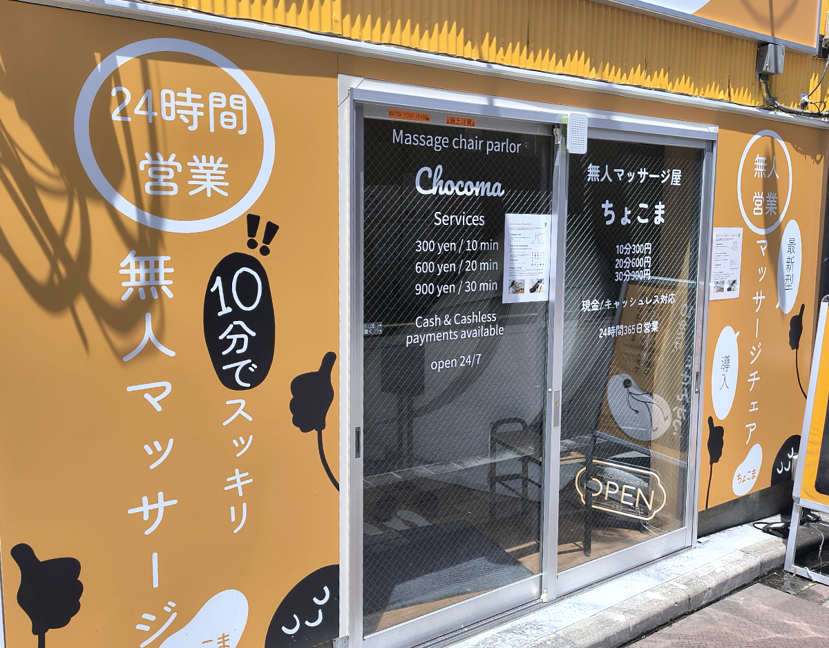 そのお店「無人マッサージ屋 ちょこま」は都内を中心に店舗を展開する、24時間営業の無人マッサージ店だ。東京に8軒、山形・山梨にそれぞれ1軒ずつ出店している。