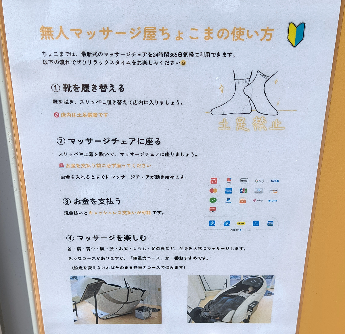 使い方を一応確認したが、難しいことは何もない。なぜなら店内にはマッサージチェアが置いてあるだけだからだ。現金、もしくは各種キャッシュレス決済を利用して、マシンに身を委ねるだけである。