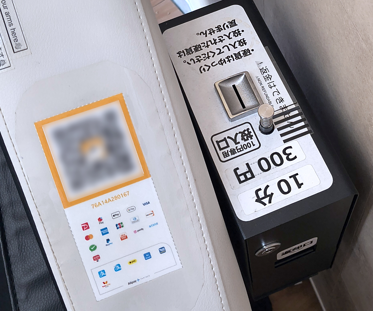 気を取り直してマッサージを受けることにしよう。まずは決済方法の確認、現金(100円玉)を利用分投入するか、もしくはスマホでQRコードを読み取って、専用サイトにアクセスしてキャッシュレス決済を行う。
