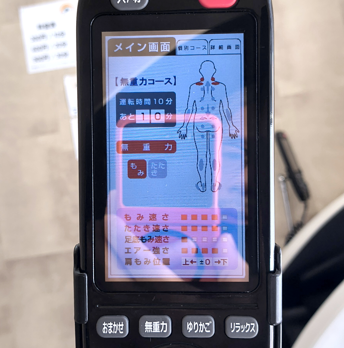 私は300円投入して10分利用することに。おまかせ・無重力・ゆりかご・リラックスの4コースから選べるようだ。私は無重力コースを選択。