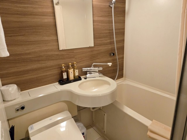 爆速で支度をし、どうにか15分ほどお風呂に浸かることができた。男女共用だけあって、風呂場にはメイク落としとシェーバークリームという、普段見ない組み合わせが並んでたぞ。ちなみにお風呂は今まで行ったドーミーインの中で一番小さかったかも……。