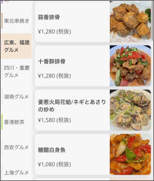 入店して席に着き、QRコードからメニューを読み込むと予想通りだった。メニューには、東北地方から四川、香港、西安、上海など、様々な地方の料理が表示される。