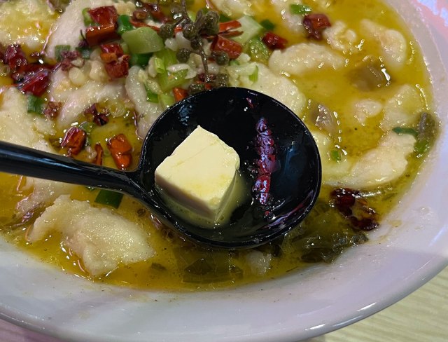 ▼酸菜魚には魚だけでなく、豆腐や高菜、そして香辛料が大量に入っていた
