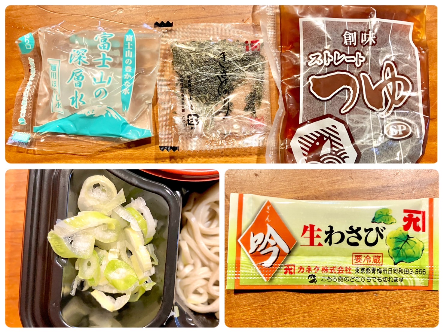 その間にふのりそばも準備しておこう。蓋を開封してみると、そばの他にめんつゆ・ほぐし水・刻みのり・青ねぎ・わさびがセットになっていた。