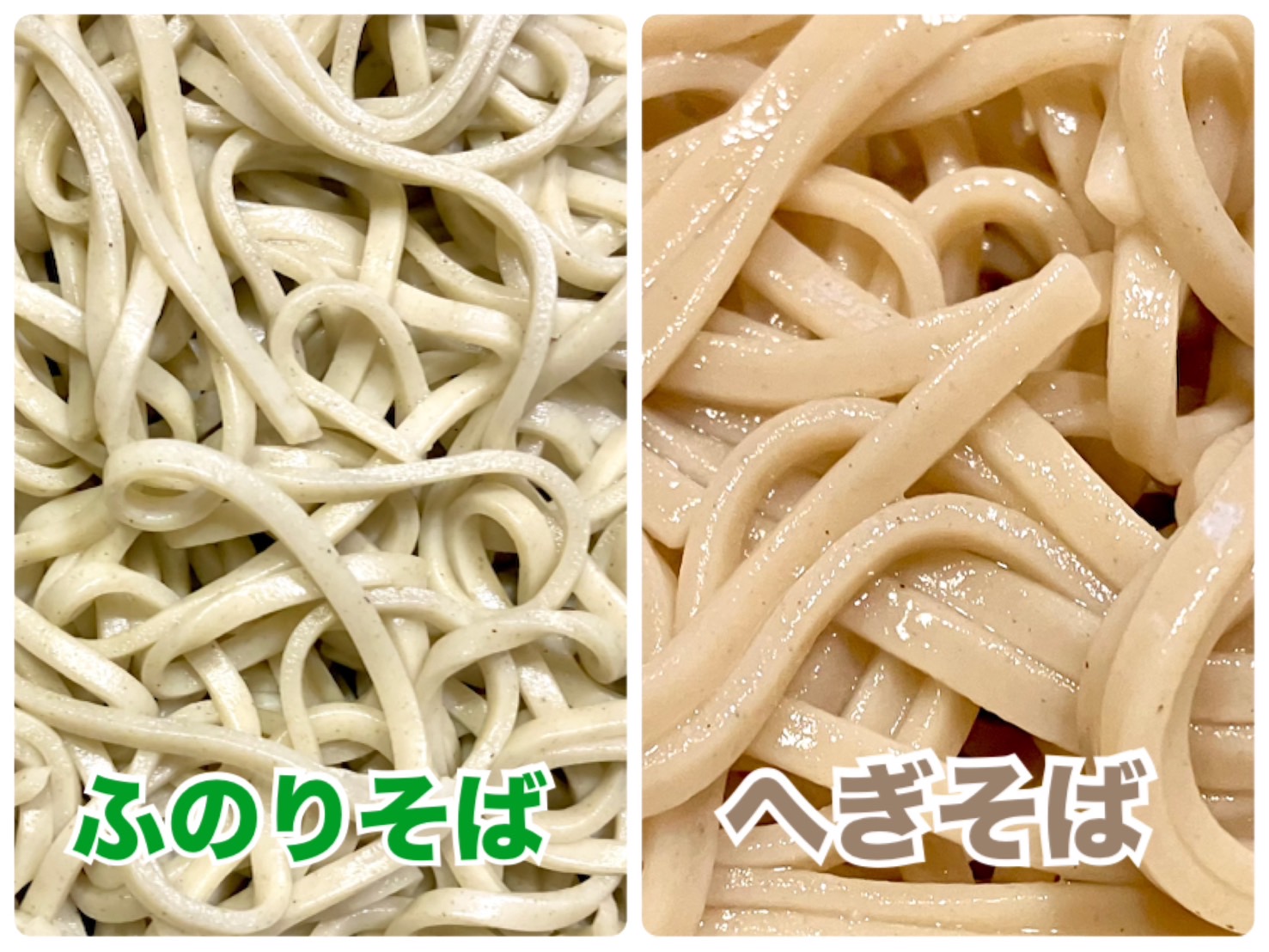 また、よく見ると麺の色も少し違っている。ふのりそばは淡い緑色だが、へぎそばの方はどちらかというと茶色寄り。