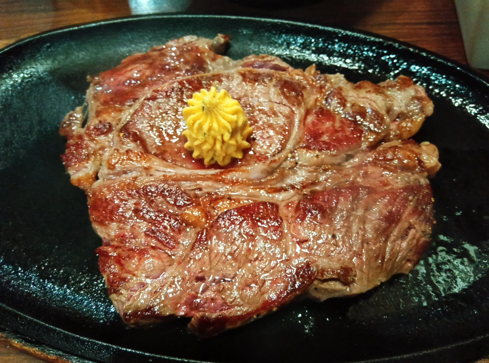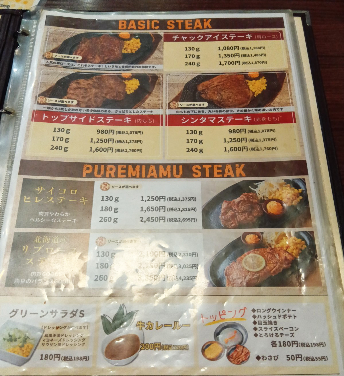 で、レギュラーメニューに肉を追加する用の追い肉システムがあるんだけど、これは170gまでとなっている。そのため、3つ目に注文したトップサイドステーキ240gはオプションではなく通常メニューで計算して税込1760円。そして、最後のチャックアイ170gは追い肉システムで税込1408円だから……