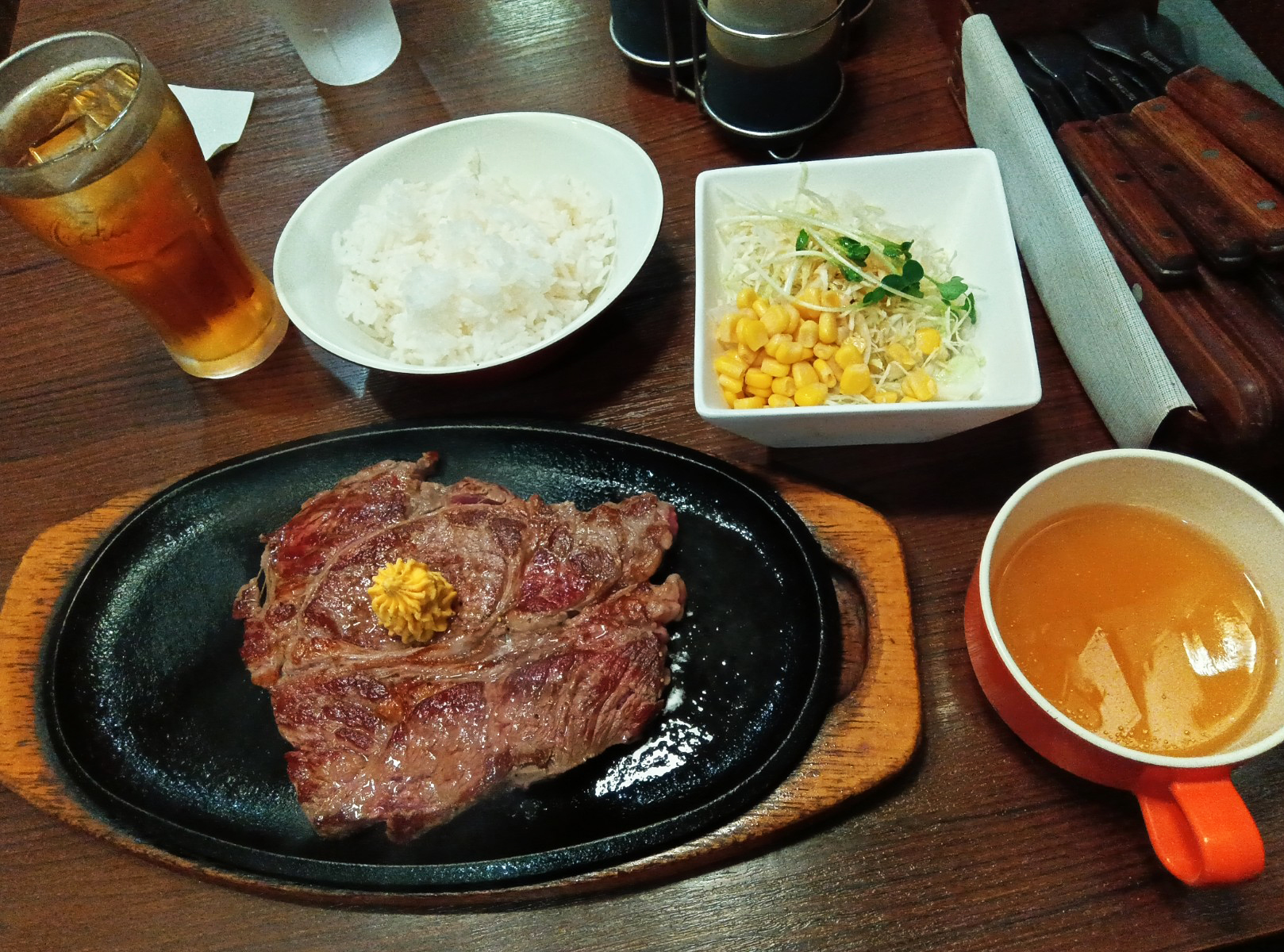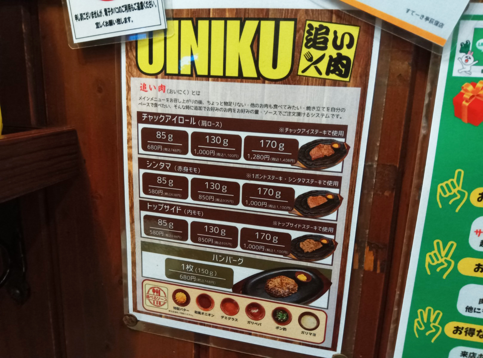 ただ、胃袋は有限だ。計画的に利用しないといけない。白飯で限られたスペースを消費しすぎるのは得策ではないだろう。メニューを見てもステーキの方が高いので、ステーキに絞る方がコスパは良い。