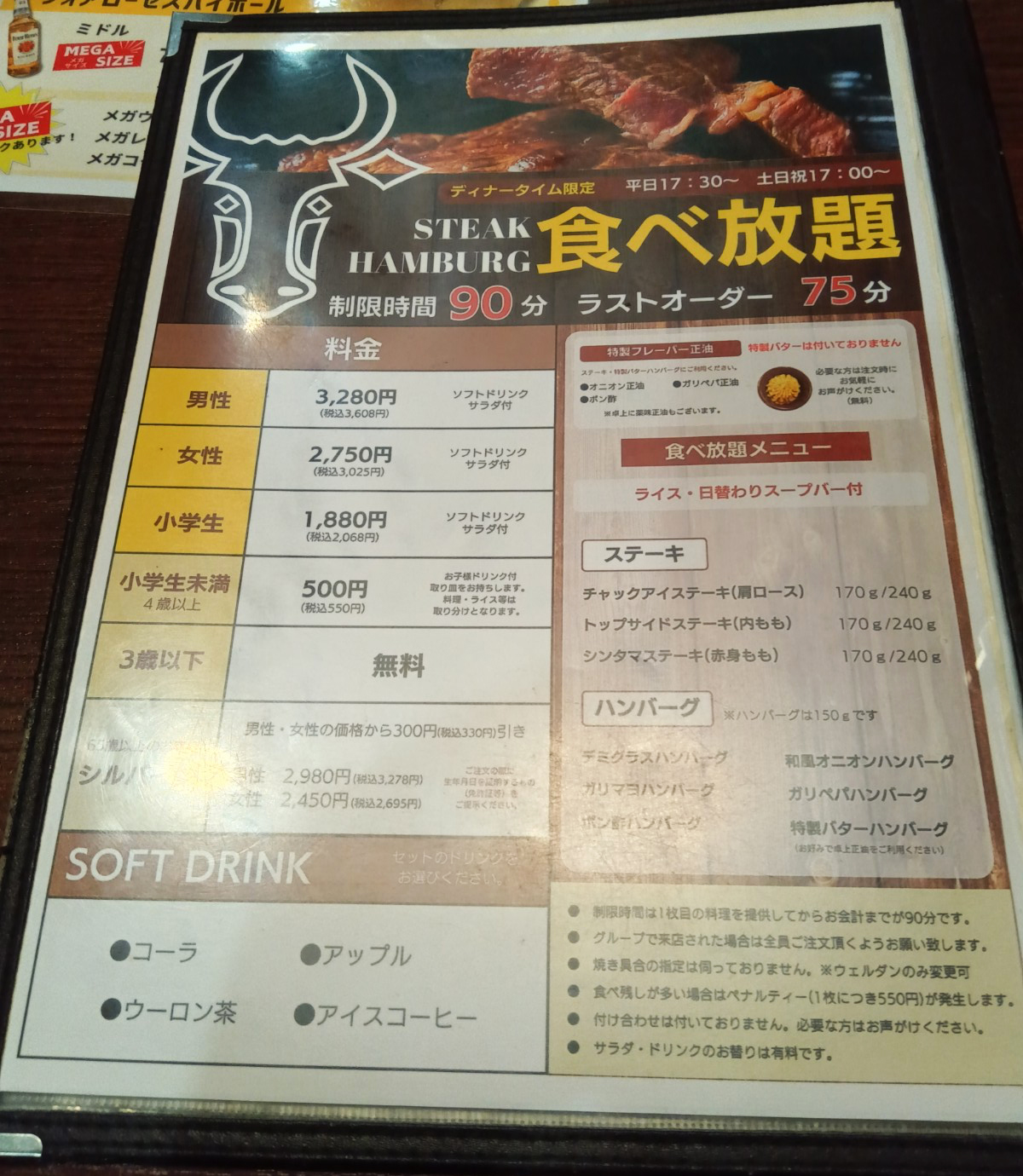 その価格は税込3608円。ハンバーグ食べ放題だけだと微妙な価格だが、ステーキも食べ放題であることを考慮すると、コスパ自体は良さそうである。ちなみに、ライス・スープは食べ放題に限らずお替りし放題だ。
