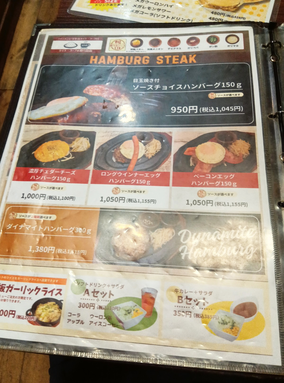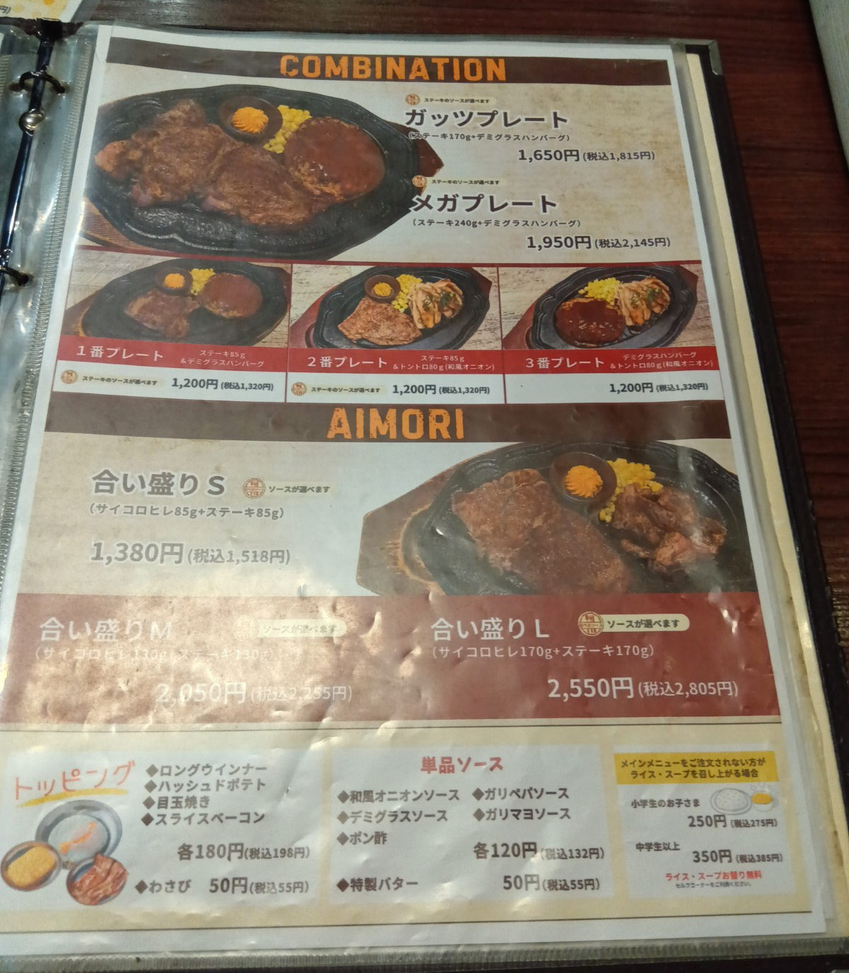 まず、私は最初に240gステーキ、2番目にハンバーグ150gを注文したけど、メニューにはこの2品のセット「メガプレート(税込2145円)」がある。