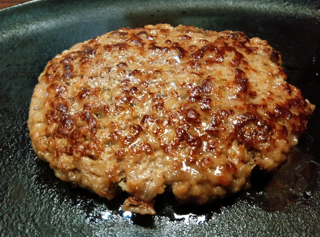 続いて、ハンバーグの味もみてみよう。しっかり焼かれたハンバーグは平べっためなタイプ。食べてみると、じんわり染み出す肉汁と共に口の中に肉の旨みが広がる。味の質としては、どこか懐かしいハンバーグだ。