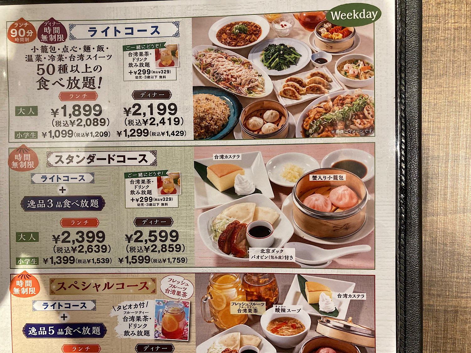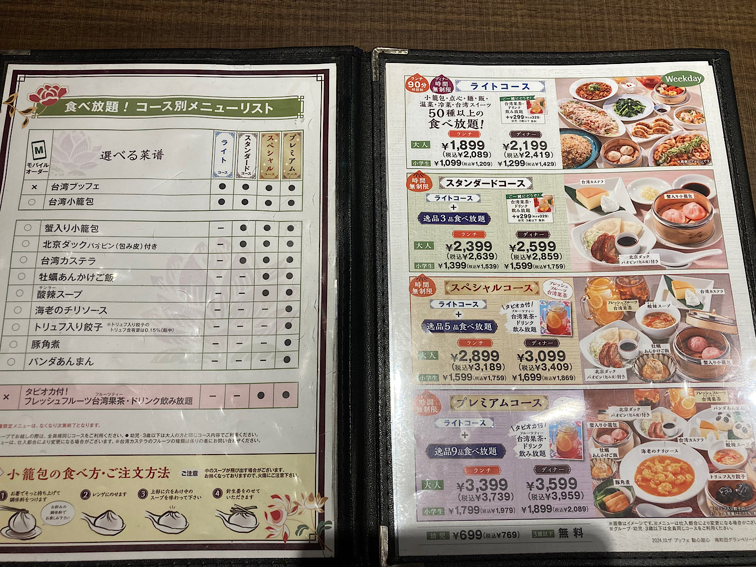 席に着くとまずコースを選択する。詳しくは公式サイトをご覧いただきたいが、基本的にビュッフェ台にあるものは全コースで食べ放題、ランクが上がるに従って小籠包などのオーダーメニューが増えていくようだ。