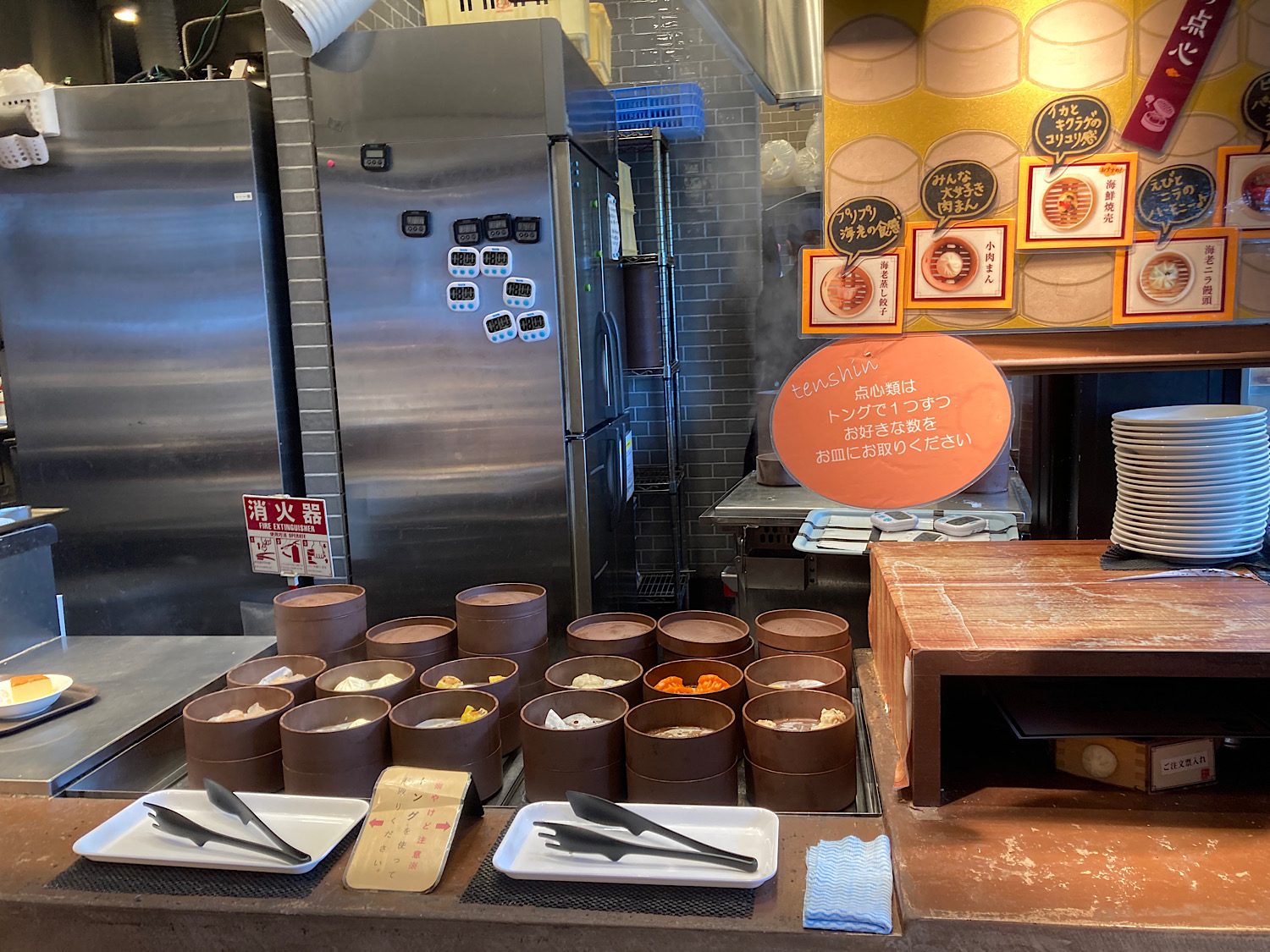 さて、まずはビュッフェ台を見てみよう。初めに出迎えてくれるのが、今まさに蒸し器で蒸されている点心の数々。