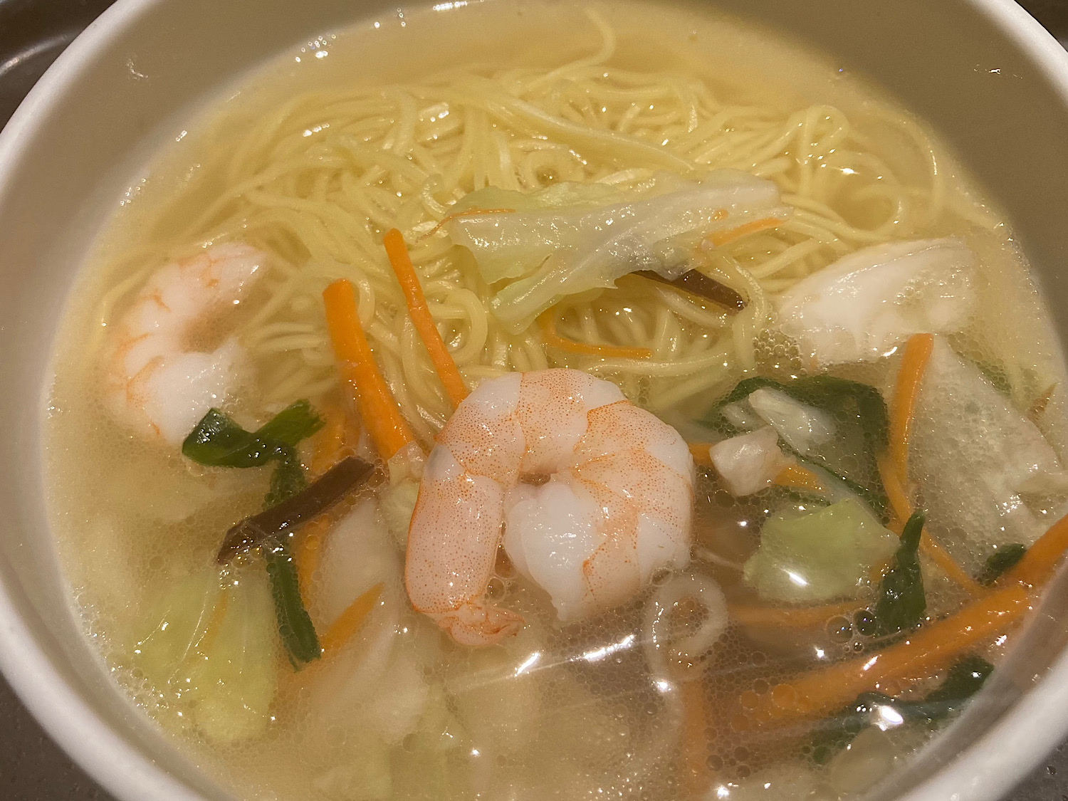 ▼ラーメン。オーダーしてから麺を茹でてくれる。食べ放題にちょうどいいミニサイズ。